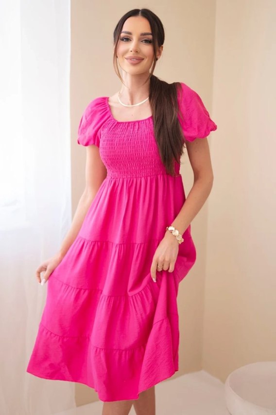 Ta urocza sukienka damska z bufiastym rękawem to propozycja idealna na ciepłe, letnie dni. Lekki, zwiewny materiał w połączeniu z elastyczną, marszczoną górą zapewnia komfort i idealne dopasowanie do sylwetki. Sukienka posiada kobiecy, kwadratowy dekolt oraz długość midi, która świetnie sprawdzi się zarówno na co dzień, jak i podczas wakacyjnych spacerów, rodzinnych spotkań czy letnich imprez. Rozkloszowany dół pięknie układa się podczas ruchu, dodając sylwetce lekkości i subtelnego wdzięku. To doskonały wybór dla kobiet ceniących wygodę, romantyczny styl i uniwersalne fasony. Dzięki elastycznej górze dopasuje się do różnych typów sylwetki, podkreślając talię i ramiona w bardzo kobiecy sposób. Rozmiar jest uniwersalny i będzie odpowiedni dla Pań w rozmiarze S, M lub L.