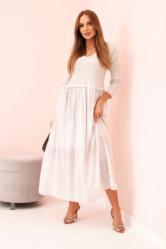 Zwiewna sukienka damska uszyta z przyjemnej w dotyku bawełnianej dzianiny, która pięknie układa się na sylwetce. Góra z prążkowanego materiału podkreśla kobiecą linię, natomiast dół z lekko marszczonym wykończeniem dodaje lekkości. Głęboki dekolt V optycznie wysmukla szyję, a długi rękaw zapewnia komfort w chłodniejsze dni.