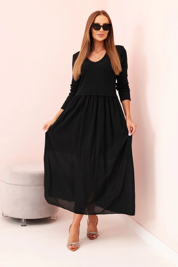 Sukienka damska z bawełną z długim rękawem i dekoltem V czarna