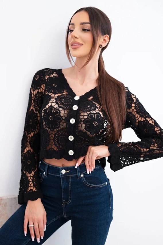 Sweter damski ażurowy letni z guzikami i długim rękawem czarny